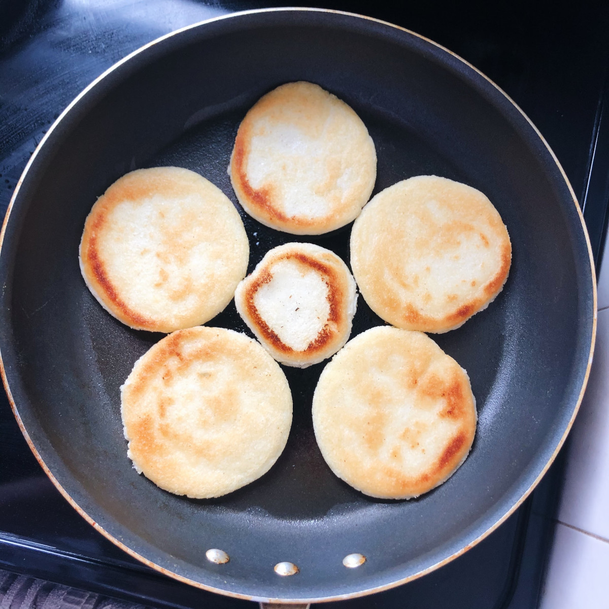 My mother’s arepas are perfectly circular, fried to an incredible toast, never too oily, thick enough to slice and stuff, thin enough to hold in one hand. Prize-winning.
