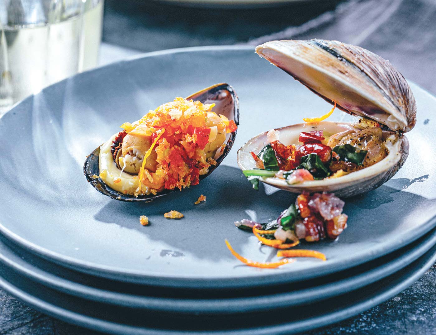 Poached Clams with Pecans, Orange, and Basil